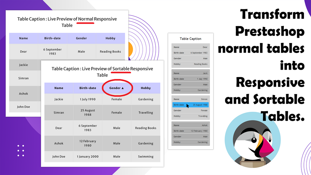 - This module will convert all tables of Prestashop website into Responsive and Sortable Tables. There is no way to select this table-wise.